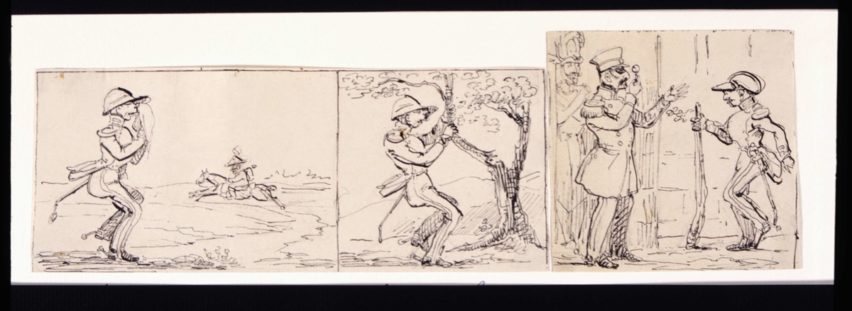 Ur "Sparfs äfventyr". Sparf beger sig till fots till sin förläggning. Tusch av Fritz von Dardel, 1840