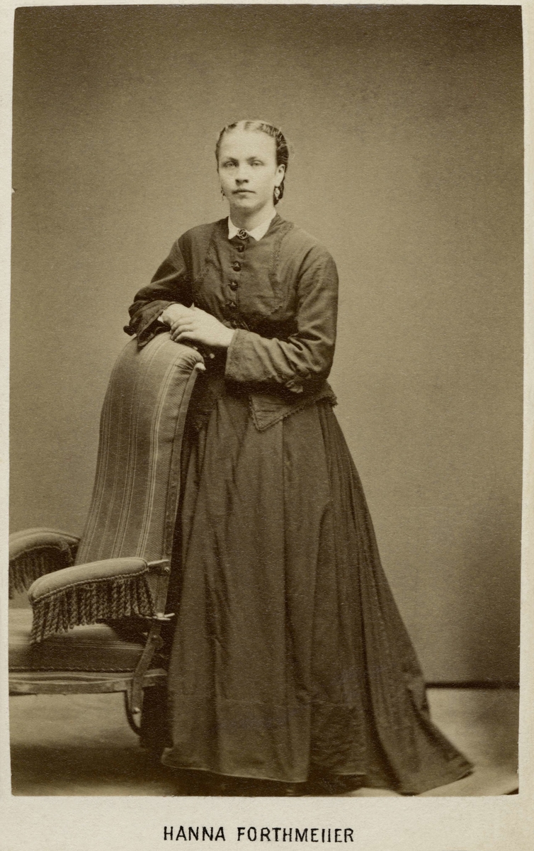 Kvinna poserar stående, lutar sig mot en fåtölj