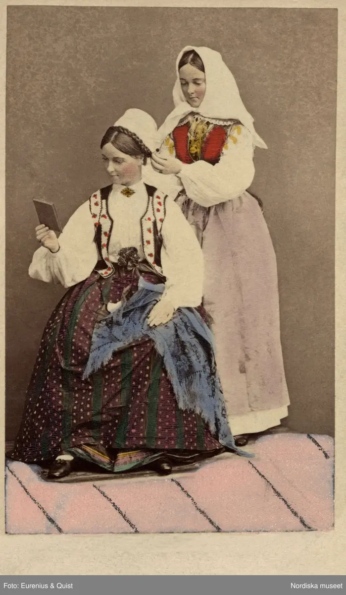 Dräktdockor med huvuden skulpterade av C A Söderman, visade på världsutställningen i Paris 1867. Två kvinnor i folkdräkter från Blekinge, varav en hjälper den andra med huvudbonaden. Handkolorerad version.