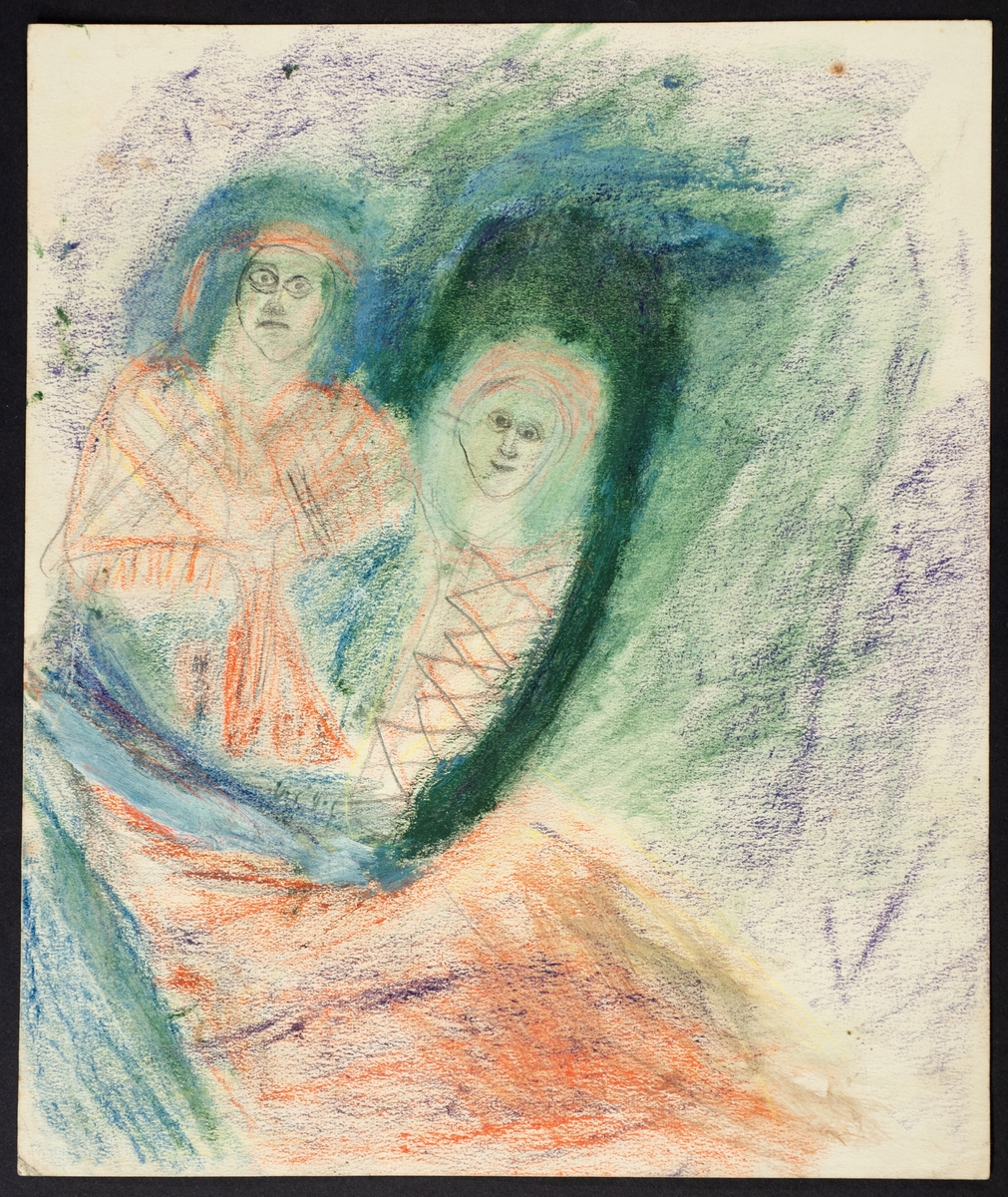 Teckning av Johan Turi. En kvinna och ett barn i kont.