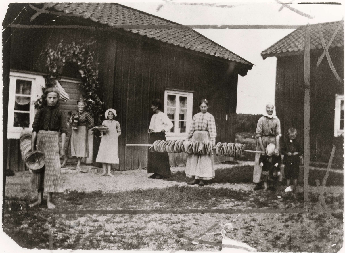 Spisbrödsbak. Köpings socken, Raglunda, Västmanland. Bilden tagen av en besökande kvinnlig släkting från Amerika vars mor står i mitten med svart kjol och vit blus. Personen med en tårta i handen har skrivit ned bakgrundsuppgifter på originalets baksida.