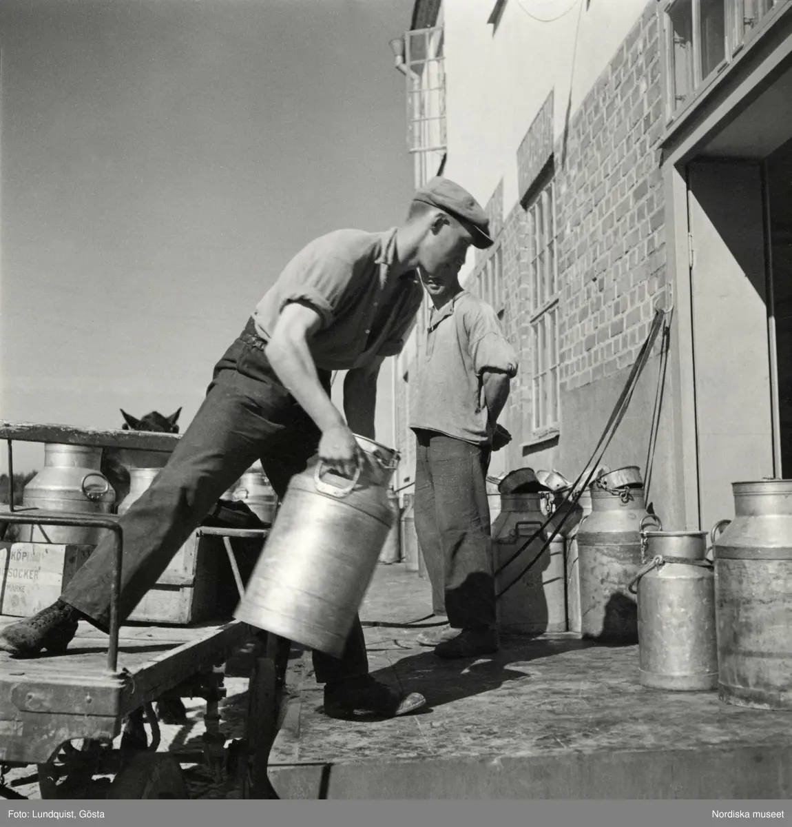 Vid Normlösa mejeri. En ung man står på flaket av en hästdragen vagn och lastar mjölkflaskor.