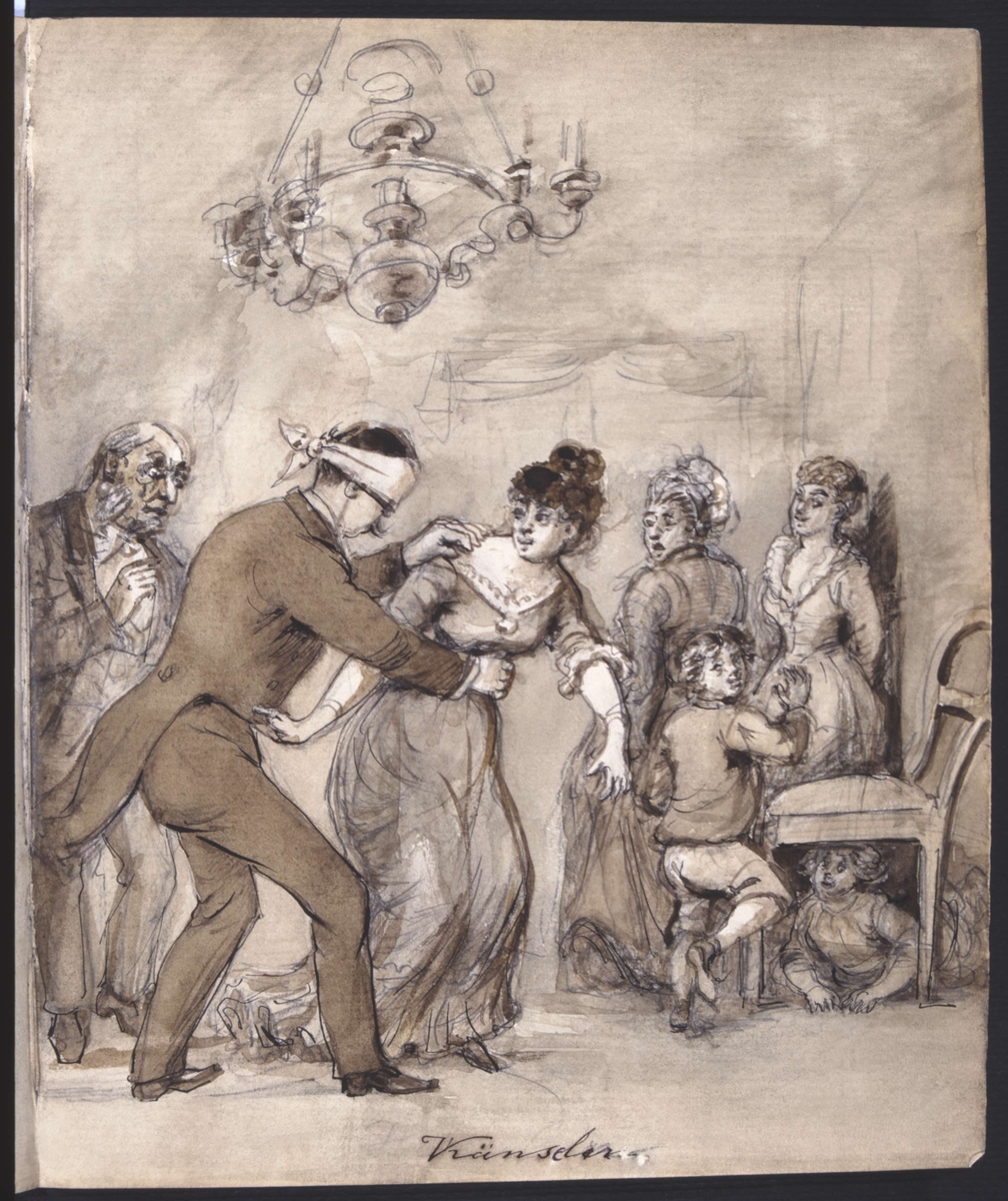 "Känseln" Människor leker blindbock. Tuschlavering av Fritz von Dardel