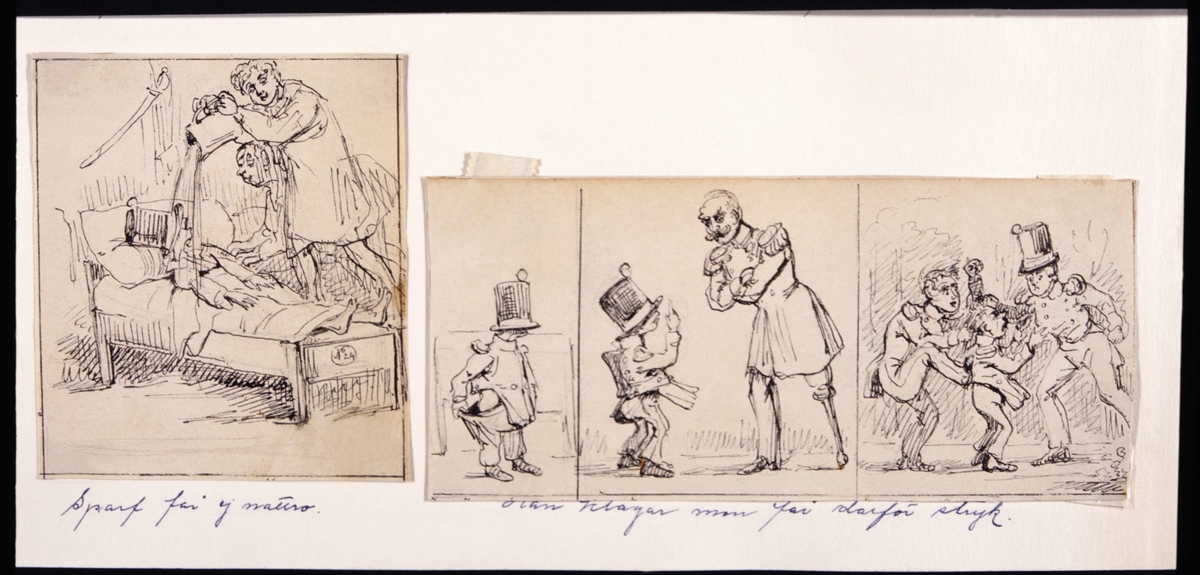 Ur "Sparfs äfventyr." "Sparf får ej nattro och han klagar men får därför stryk". Tusch av Fritz von Dardel, 1840