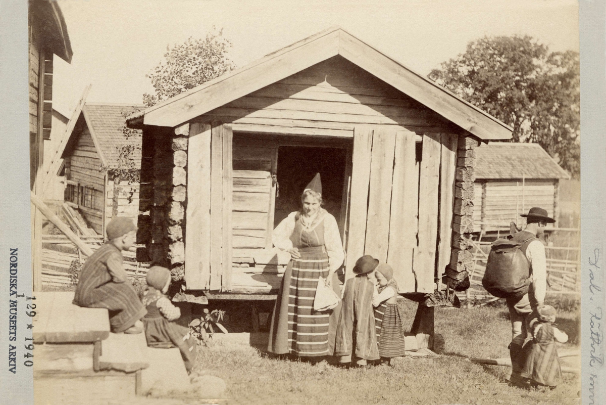 En familj med småbarn, utanför ett härbre.