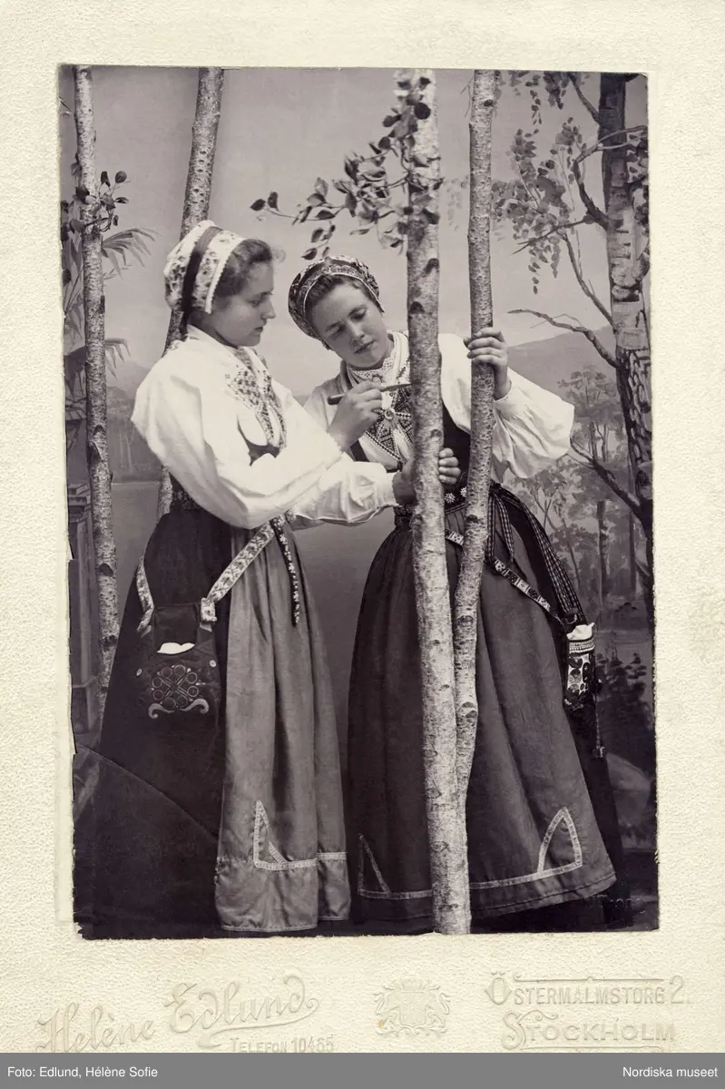 Två unga kvinnor i folkdräkt, ristar i en trädstam