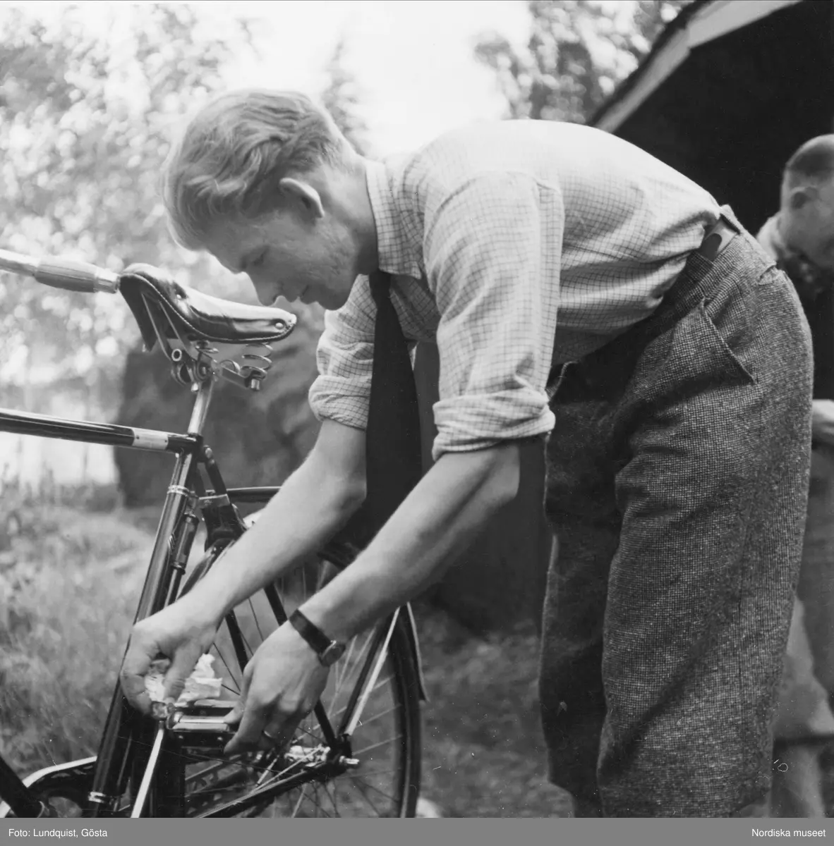 Cykelvård, en ung man klädd i knäbyxor och skjorta med uppkavlade ärmar, torkar tramporna på en cykel.