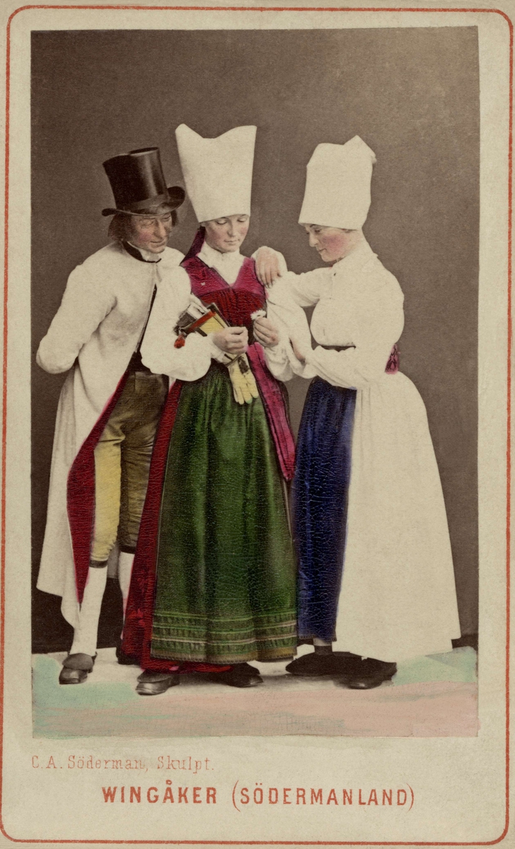 Titel: Dräktdockor med huvuden skulpterade av C A Söderman, troligen visade på världsutställningen i Wien 1873. Man och kvinnor i dräkter från Vingåker, Södermanland. Handkolorerat fotografi efter förlaga från målning av J W Wallander.