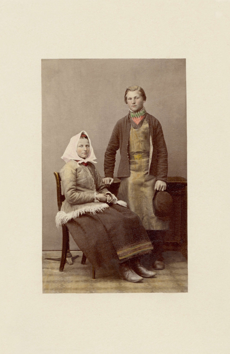 Ett ungt par poserar i folkdräkt från Dalarna, kvinnan i en kort pälskantad skinnjacka, mannen i skinnförkläde och jacka. handkolorerat foto.