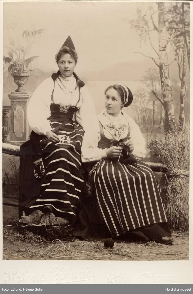 Två unga flickor poserar i folkdräkter från Dalarna.