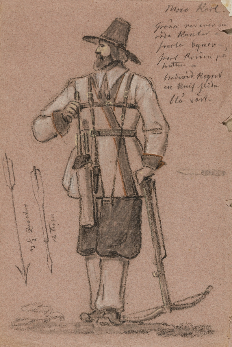 Akvarell. "Mora Karl ", dräktskiss med detaljskisser på vapen, ur skissbok ur Johan Gustaf Sandbergs arkiv INV.NR 0080508.