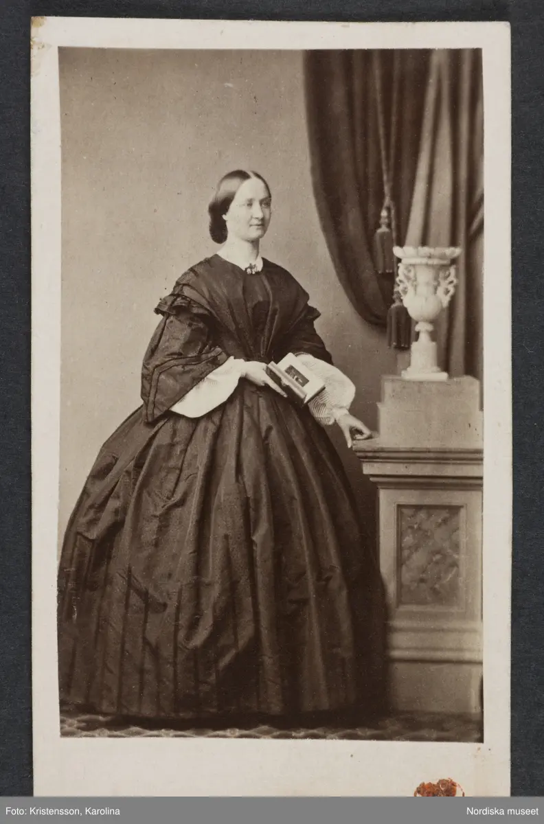 Visitkort, ateljéporträtt av Emelie Geijer hållande ett fotoalbum.