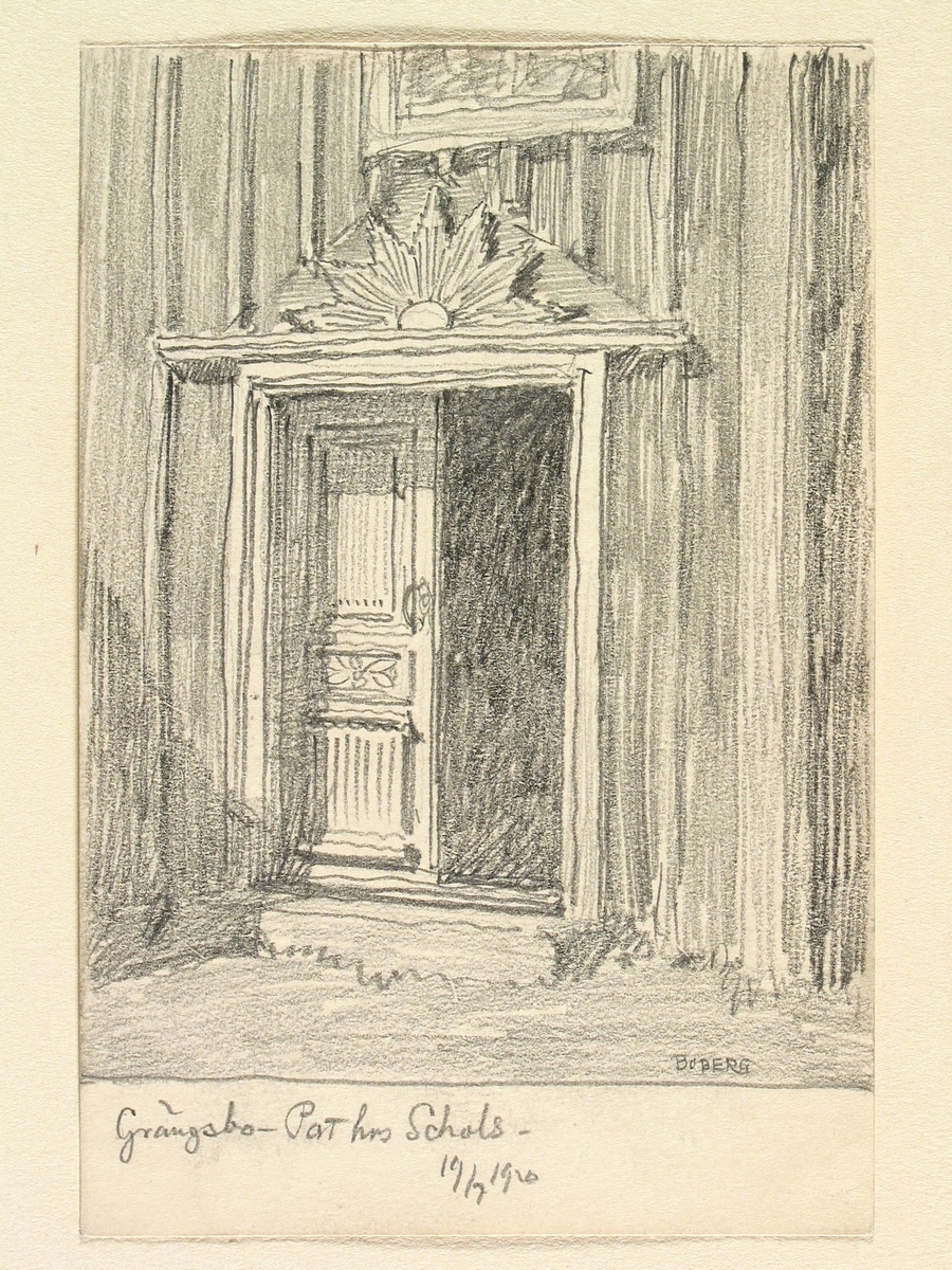 Hälsingland, Alfta sn., Grängsbo. "Port hos Schols". Teckning av Ferdinand Boberg