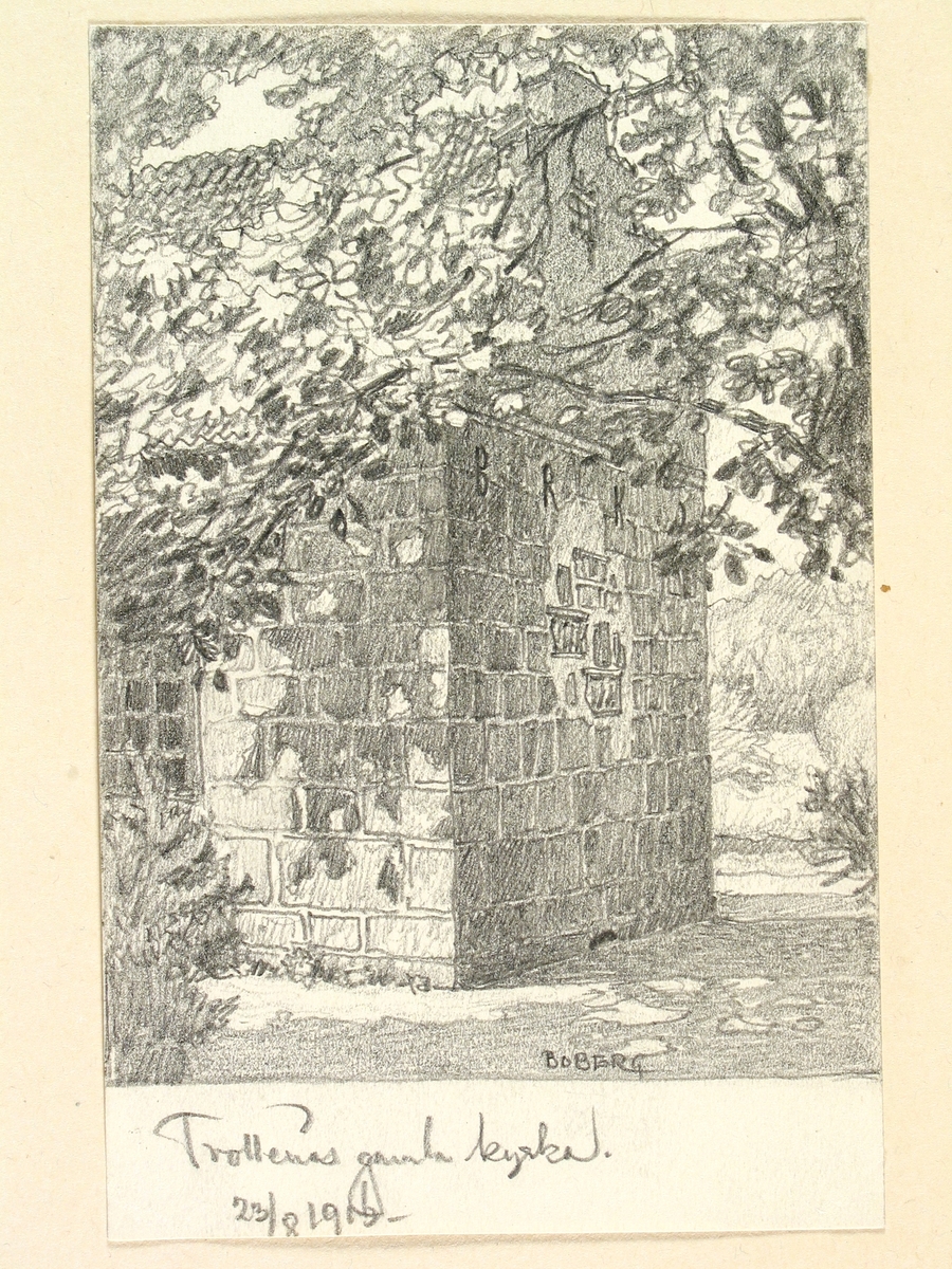 Teckning av Ferdinand Boberg. Skåne, Onsjö hd., Näs sn., Trollenäs kyrka