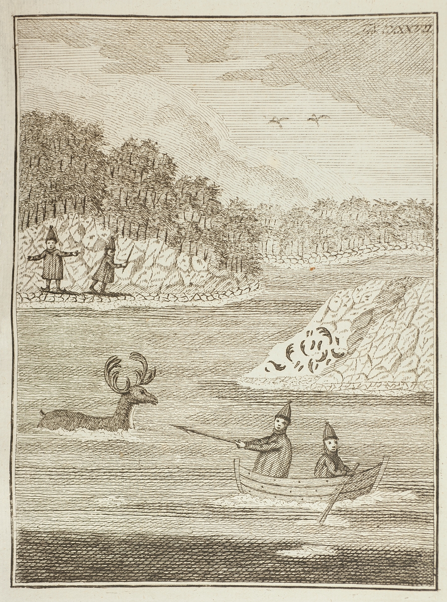 Stick ur Knud Leems bok: Beskrivelse over Finmarkens lapper, deres tungemaal, levemaade og forrige afgudsdyrkelse med J.E. Gunneri Anmaerkninger. Tab. LVXXVII. Jakt på ren från båt.
