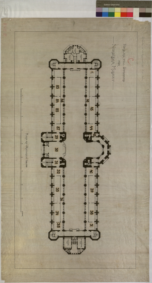 Ritning på väv över Nordiska museets huvudbyggnad. Förslag till byggnad för Nordiska museet. Plan av våningen 1 trappa upp. Planritning, galleri, katalog. 55x96 cm. Tusch, blyerts, klistring. Linjalritning. Osignerad.