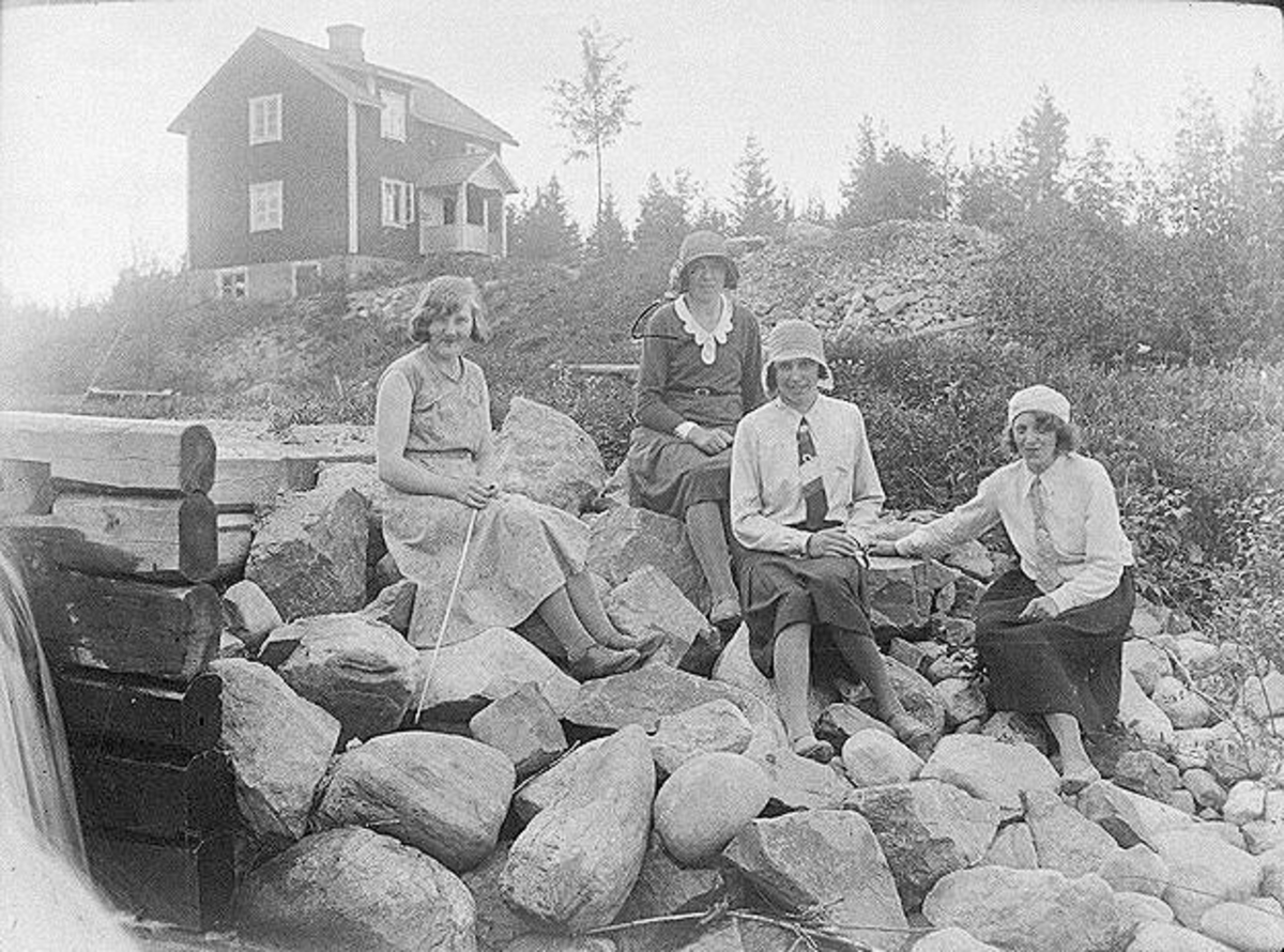 Fyra kvinnor sitter på en hög av stenar, ett hus i bakgrunden.