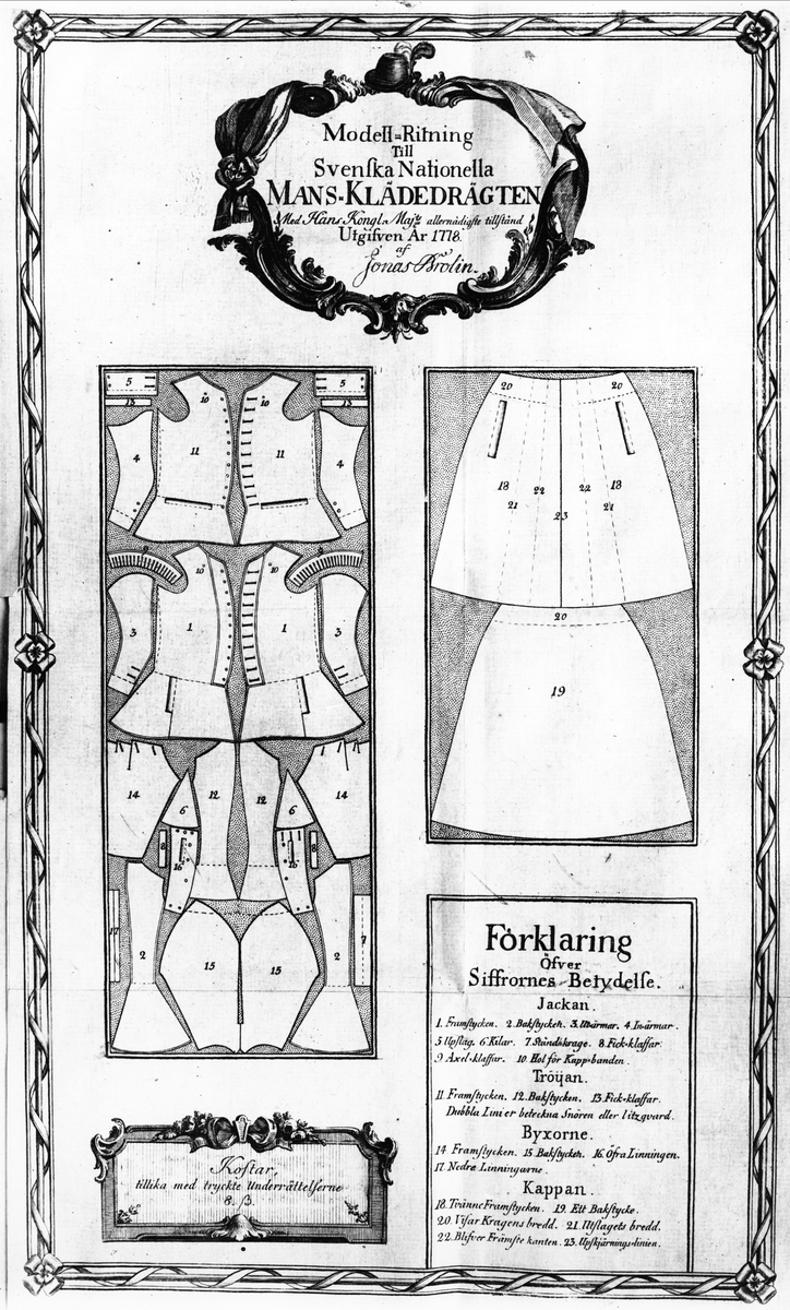 Gustaf III:s nationella dräkt/svenska dräkten. "Modell-Ritning till Svenska Nationella Mans-Klädedrägten". Gravyr från 1778.