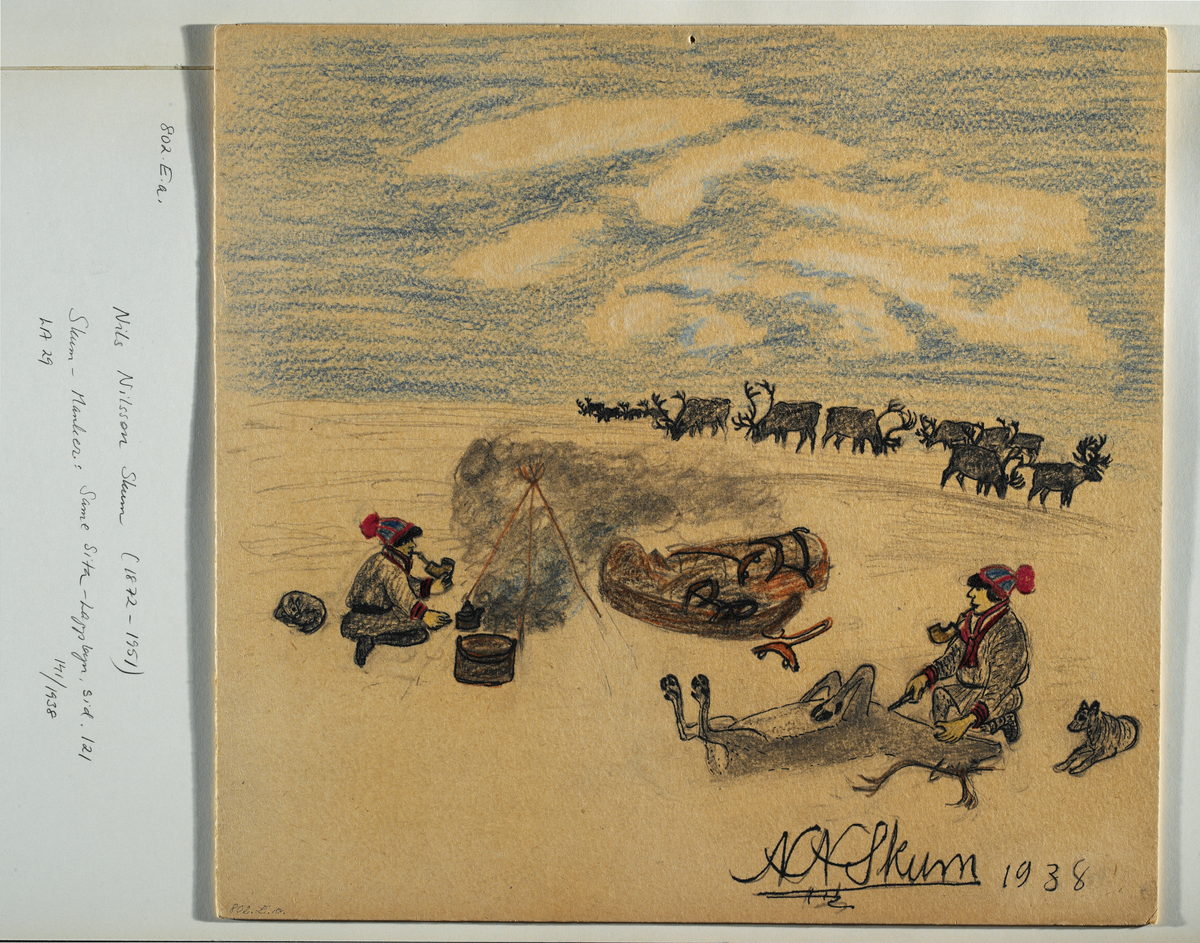 Teckning av Nils Nilsson Skum, daterad 1938. Två samiska män och hund vid lägereld. Den ena flår en slaktad ren. Renhjord i bakgrunden. Vinter.