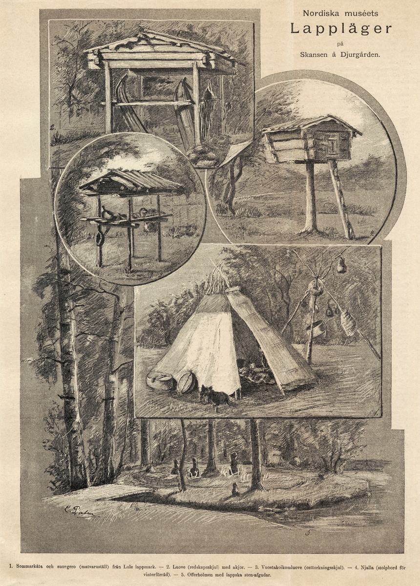 Teckning av C. Palm i tidningen Svea nr 40 1891 3/10. Rubriken lyder: Nordiska museets Lappläger på Skansen å Djurgården.