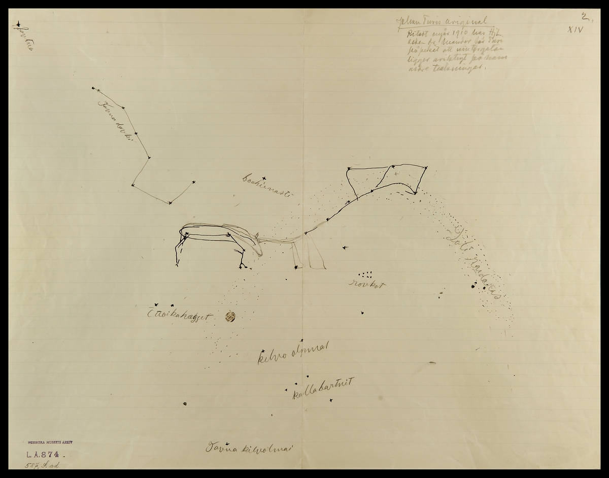 Skilda lappmarker. Teckning av Johan Turi. L.A. 874 nr. 12 Stjärnhimmel med text på samiska och svenska.