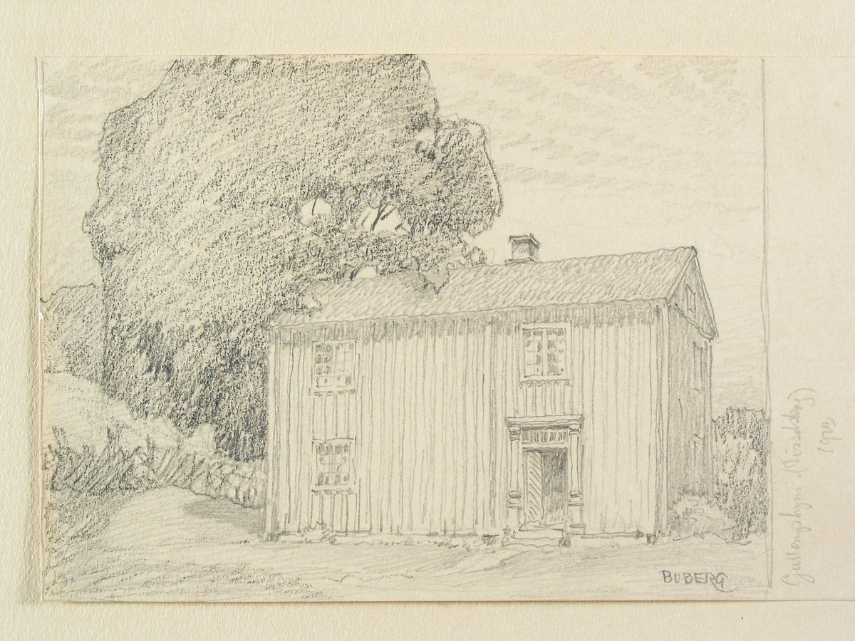 Dalsland, Tisselskogs sn., Gullarpsbyn. Boningshus. Teckning av Ferdinand Boberg.