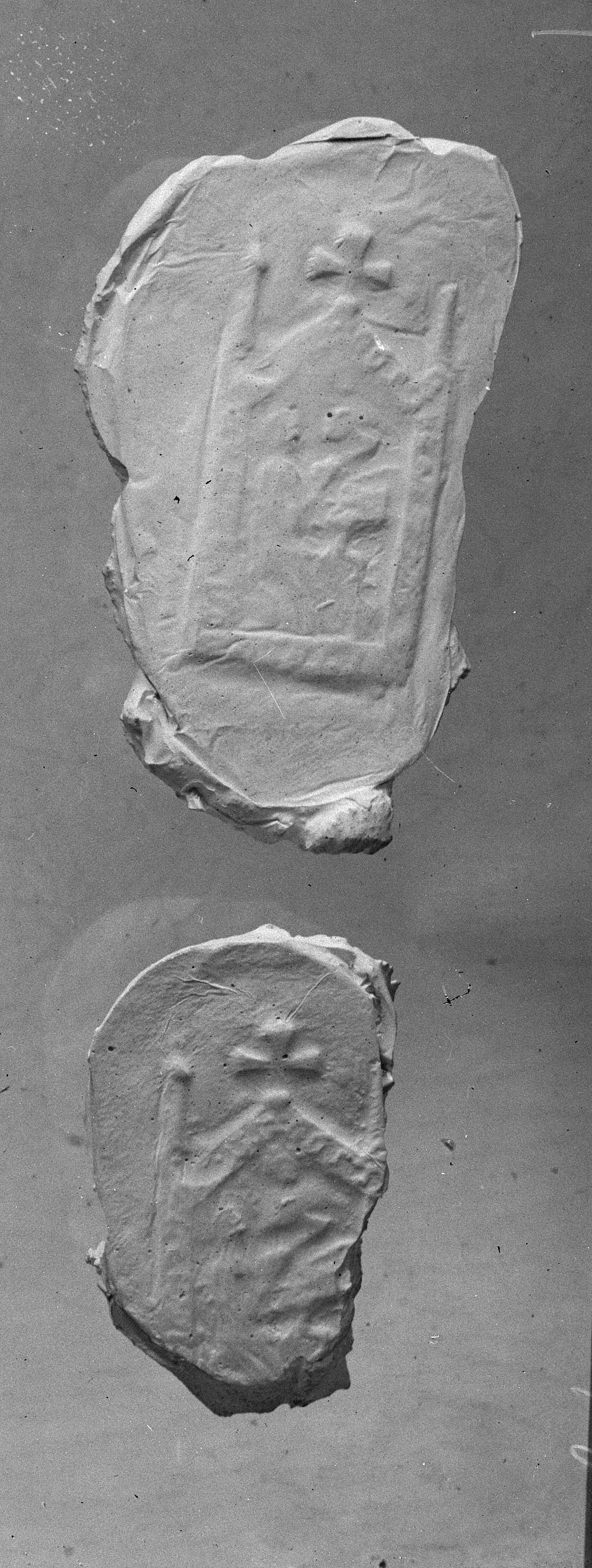 Avtryck av pilgrimsmärke från Vadstena ingjutet på klocka.