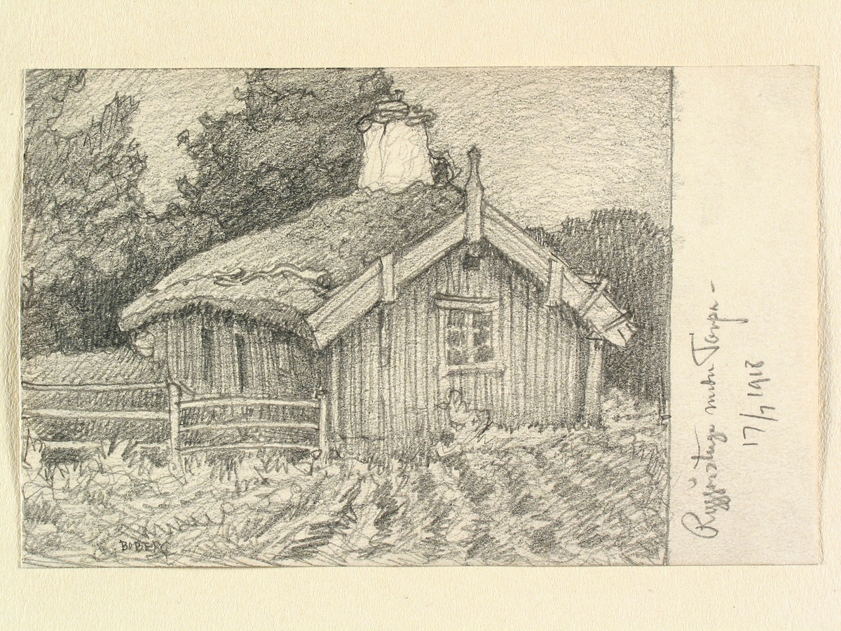 Västergötland, Kinds hd., Länghems sn. "Ryggåsstuga under Torpa". Teckning av Ferdinand Boberg.