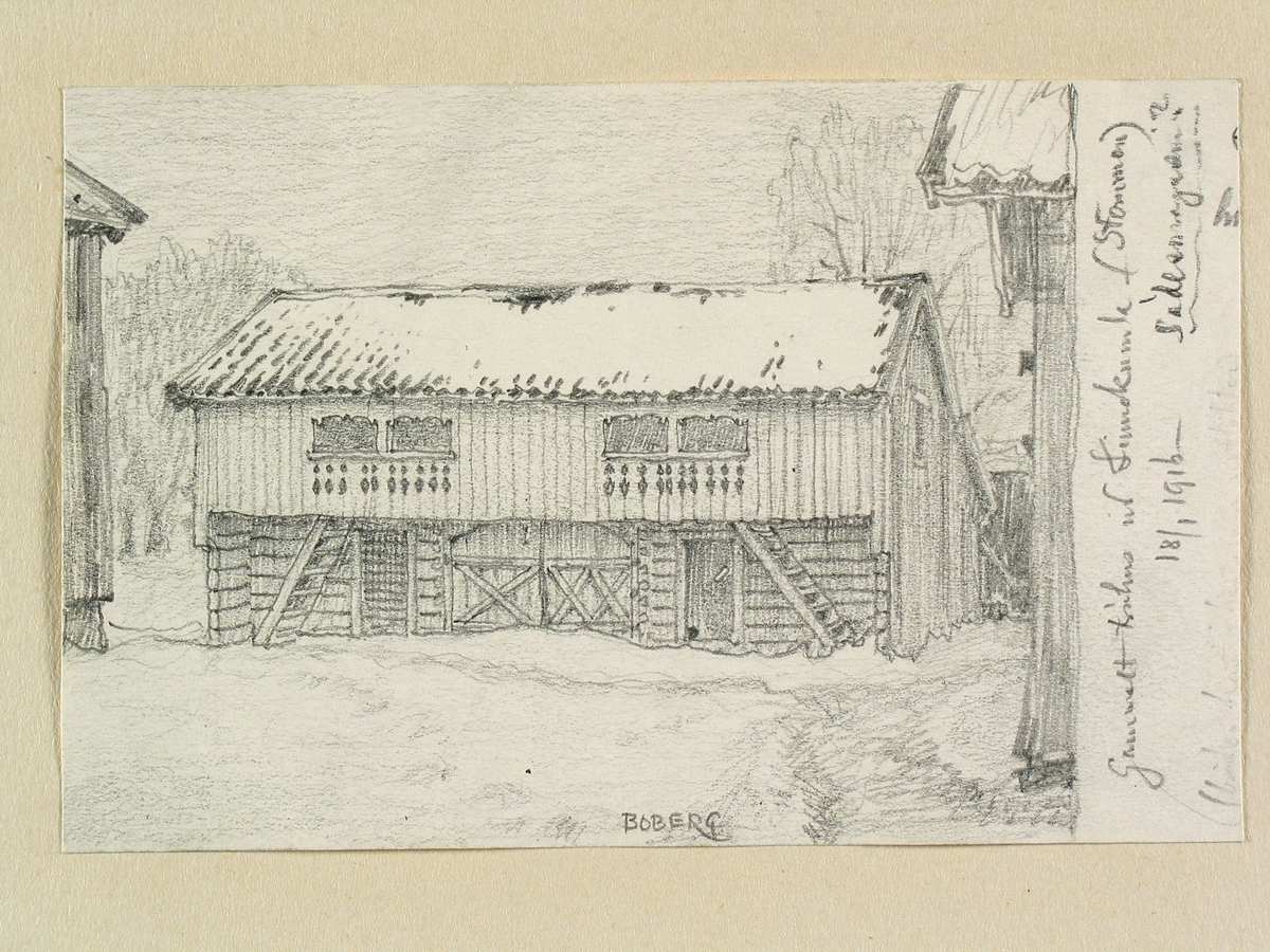 Västergötland, Kinds hd., Finnekumla sn. "Gammalt trähus vid Finnekumla (Stommen) gammalt sädesmagasin?" Teckning av Ferdinand Boberg.