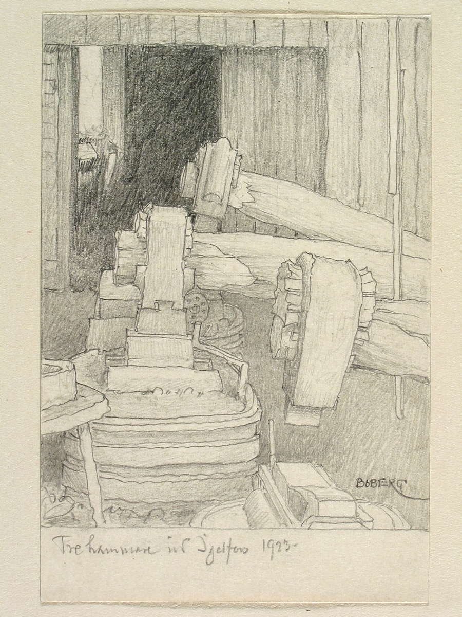 Tre hammare i Igelfors, Östergötland. Teckning av Ferdinand Boberg