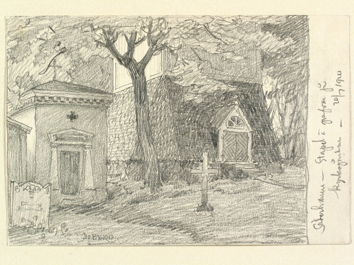 Söderhamn, Hälsingland. Stapel och gravar på kyrkogården. Teckning av Ferdinand Boberg