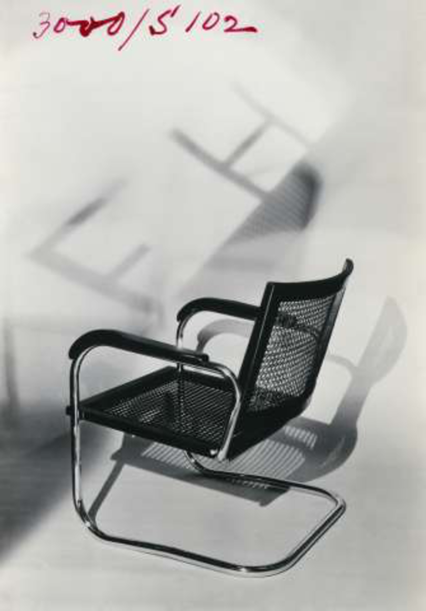 Stålrörsmöbel, karmstol med rottingsits och ryggstöd.