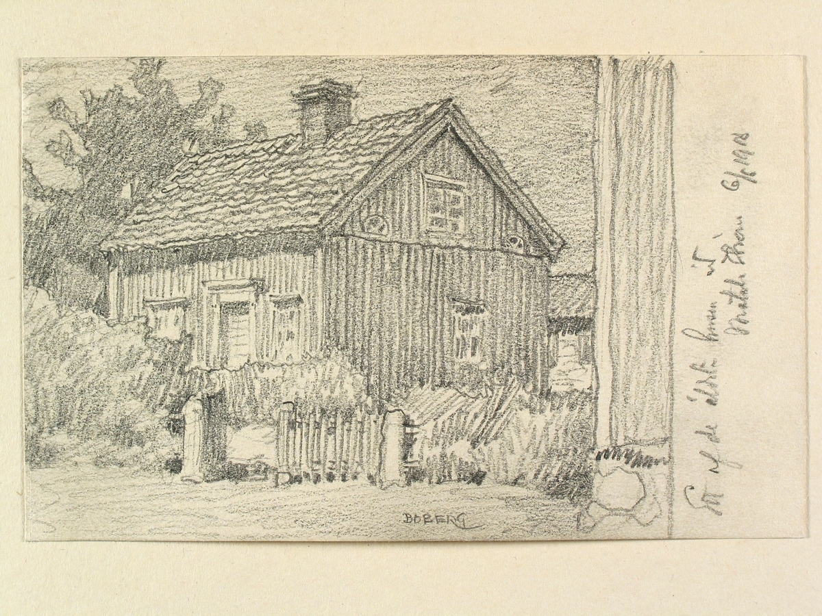 Motala. "Ett af de äldsta husen vid Motala Ström". Teckning av Ferdinand Boberg.
