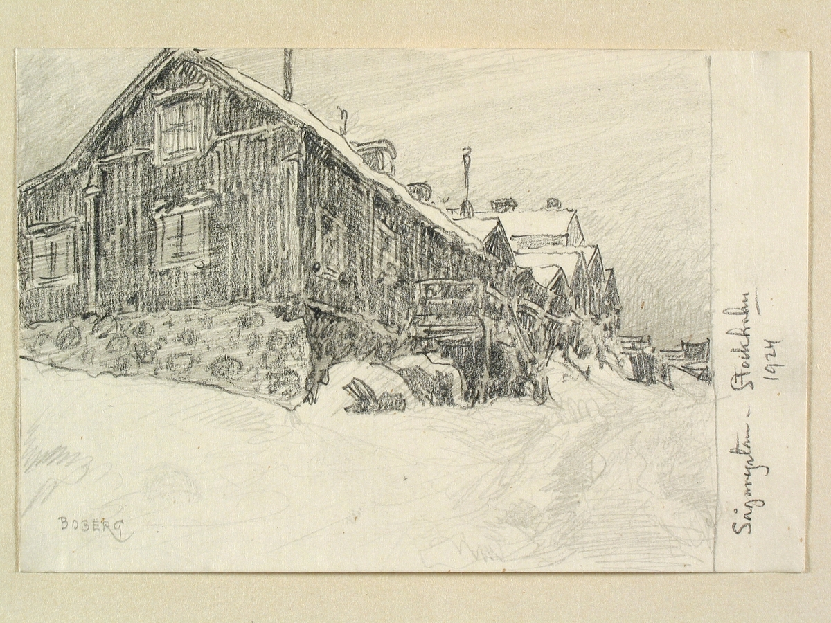 Titel: "Sågaregatan, Stockholm 1924", Södermalm.Teckning av Ferdinand Boberg.