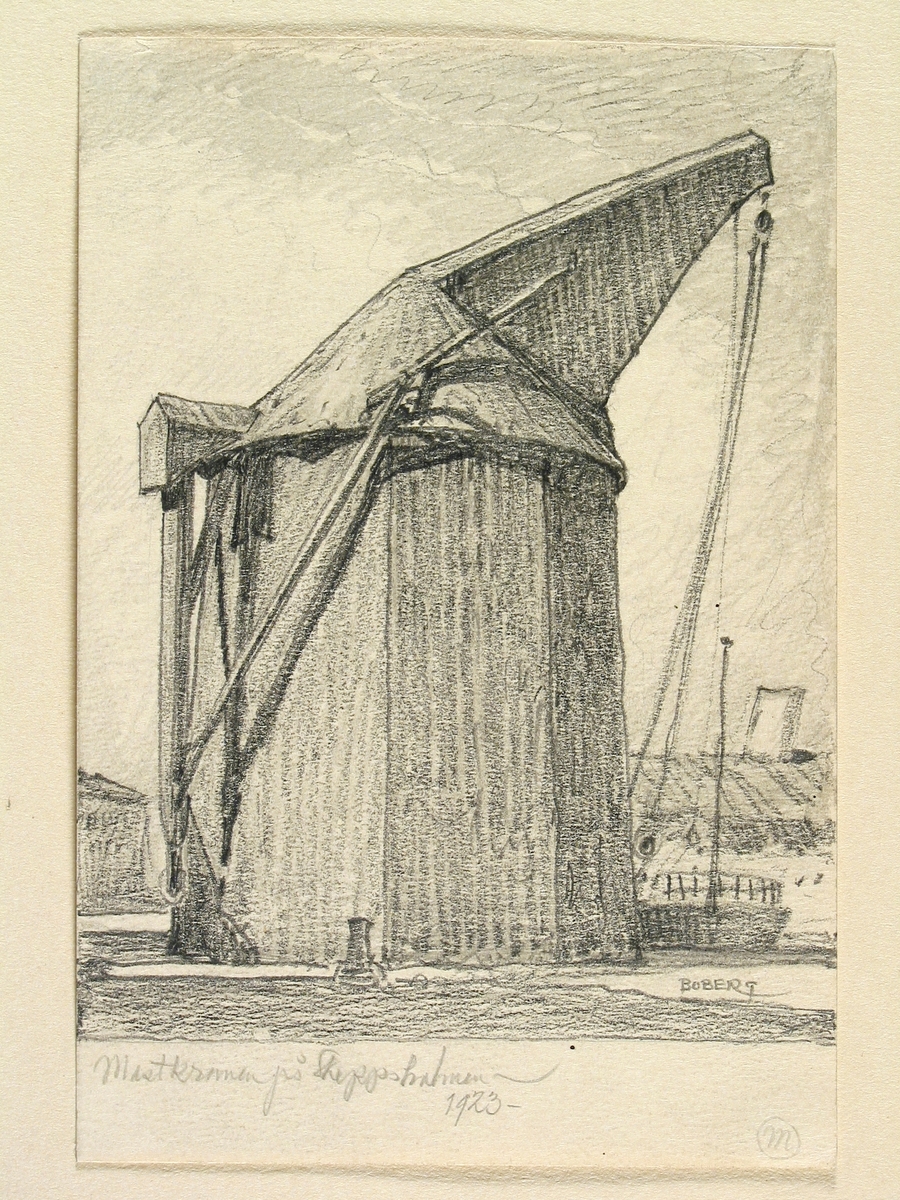 Teckning av Ferdinand Boberg. Stockholm, Norrmalm, texten lyder: "Mastkranen på Skeppsholmen, 1923"