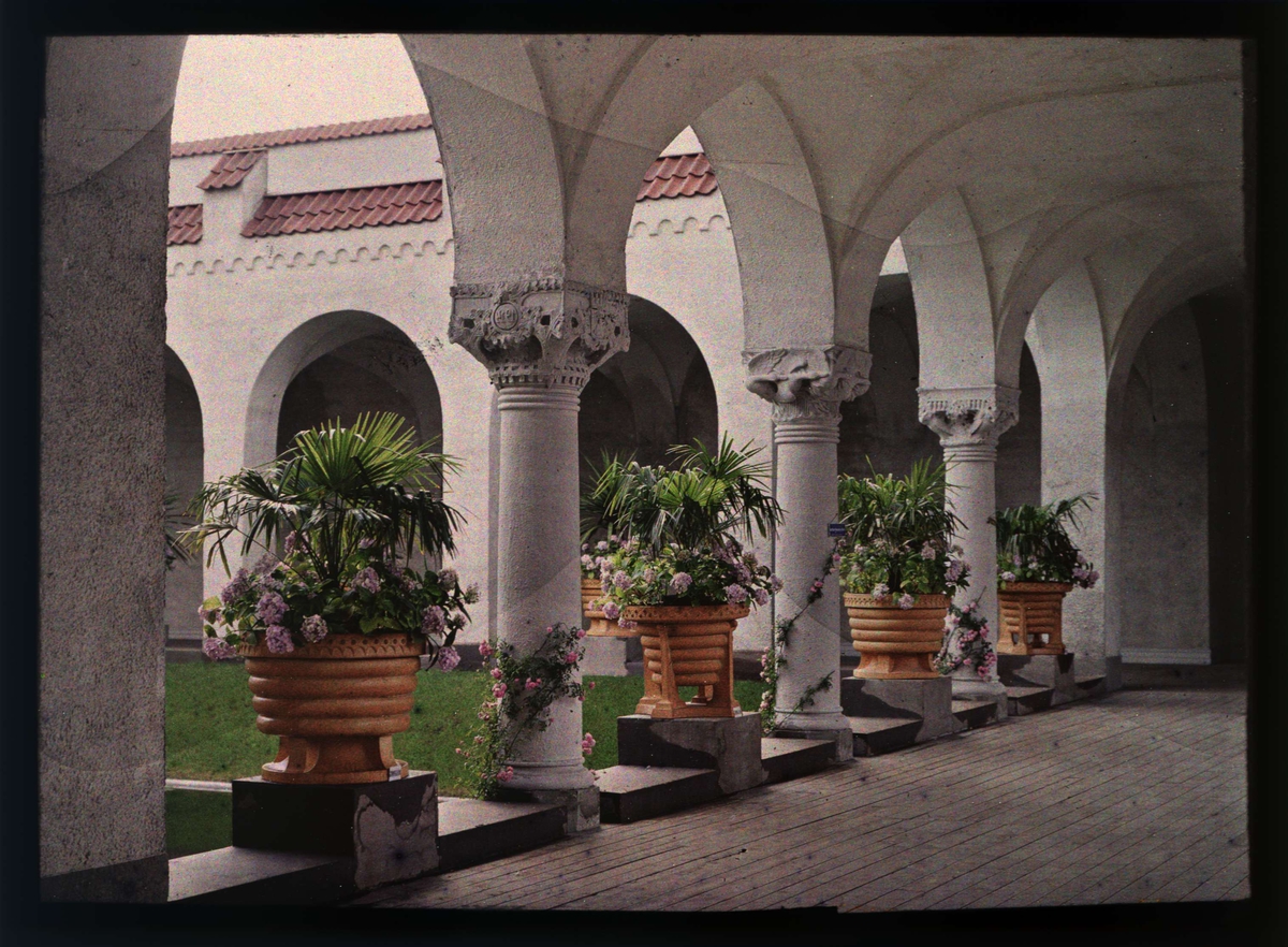 Ferdinand Bobergs arkitektur från Baltiska utställningen 1914. Valvbågar och blomsterurnor. Autochrome / Autokromfotografi.