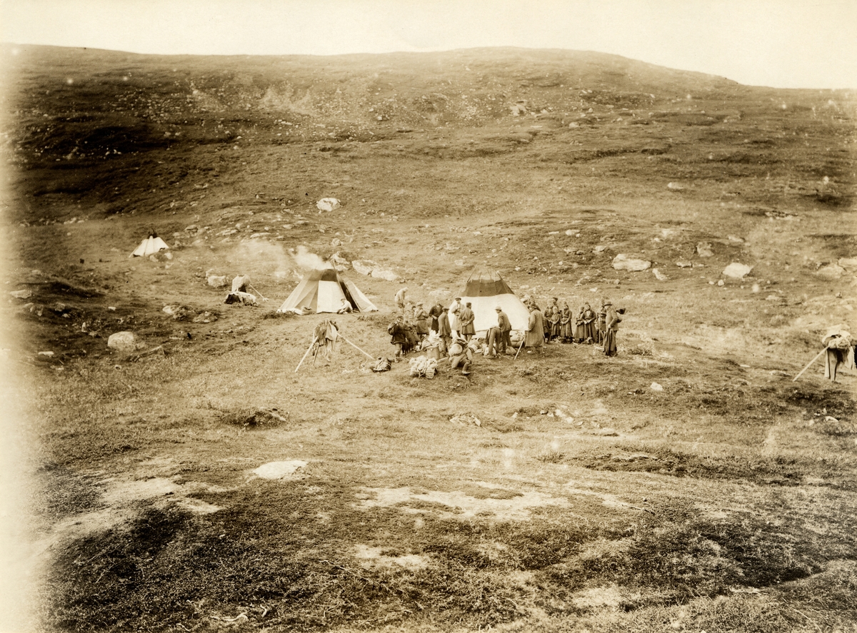 En grupp människor vid en kåta i Vastenjaure. STF, styrelsens resa i Lappland.