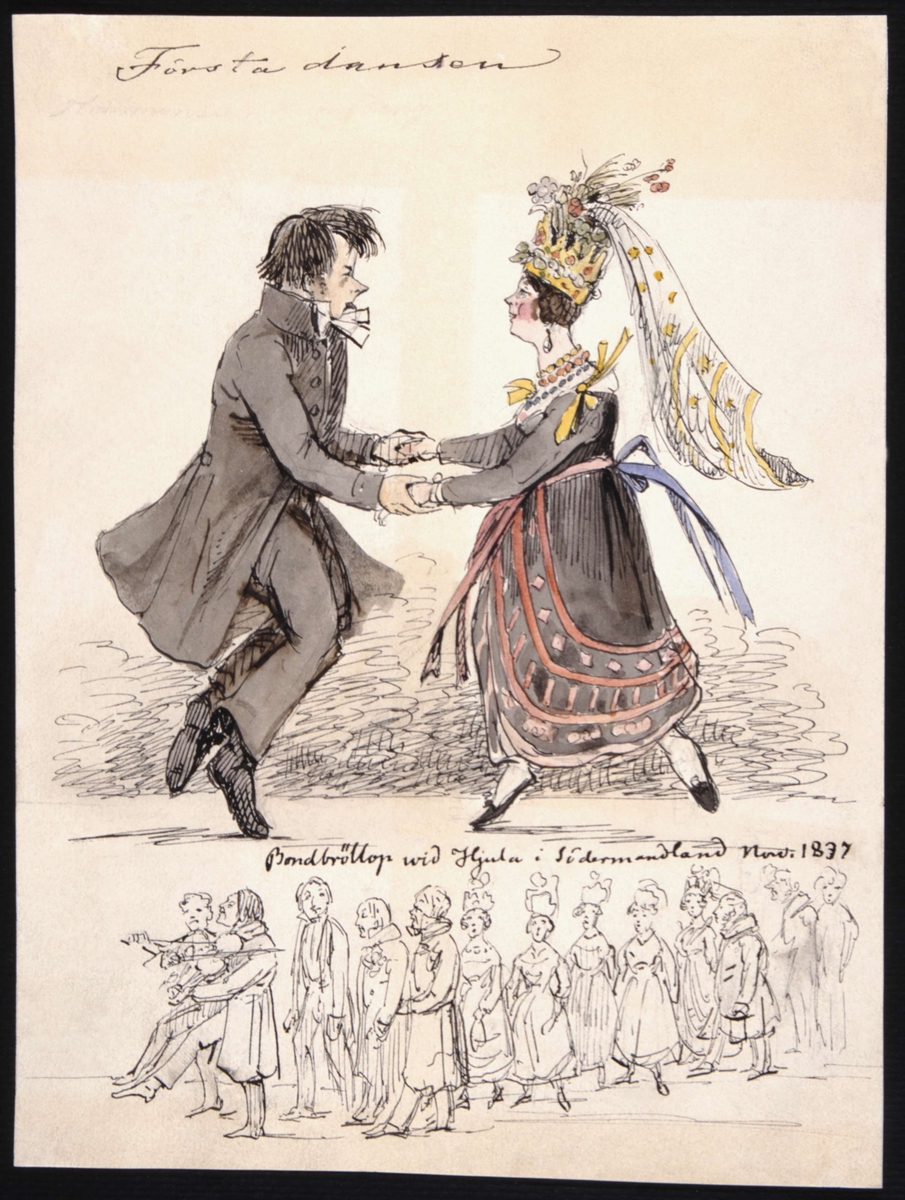 "Första dansen". "Bondbröllop vid Hjula i Södermanland nov. 1837". Akvarell av Fritz von Dardel, 1837