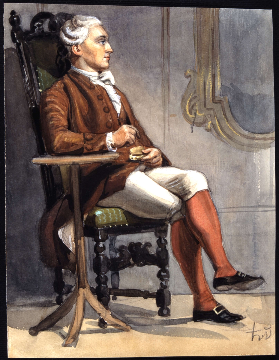 "Man i historisk dräkt som sitter i en stol." Akvarell av Fritz von Dardel