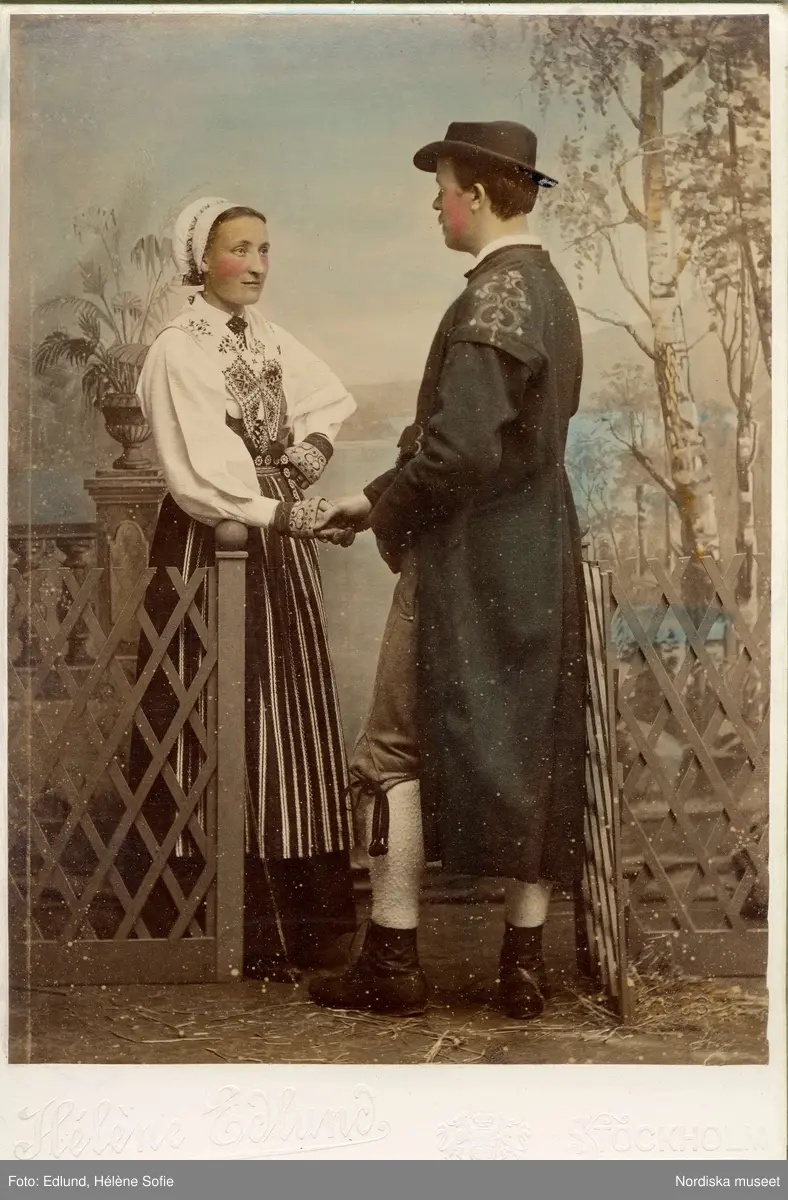 En man och en kvinna poserar i folkdräkter. Klädda i högtidsdräkter från Leksand, Dalarna, kvinnan bär s.k. svartstickshalskläde samt broderade halvvantar i skinn, mannen i långrock med silkebroderier på axlarna. Kvinnans vita huvudbonad kallas hatt och bars av gifta kvinnor.