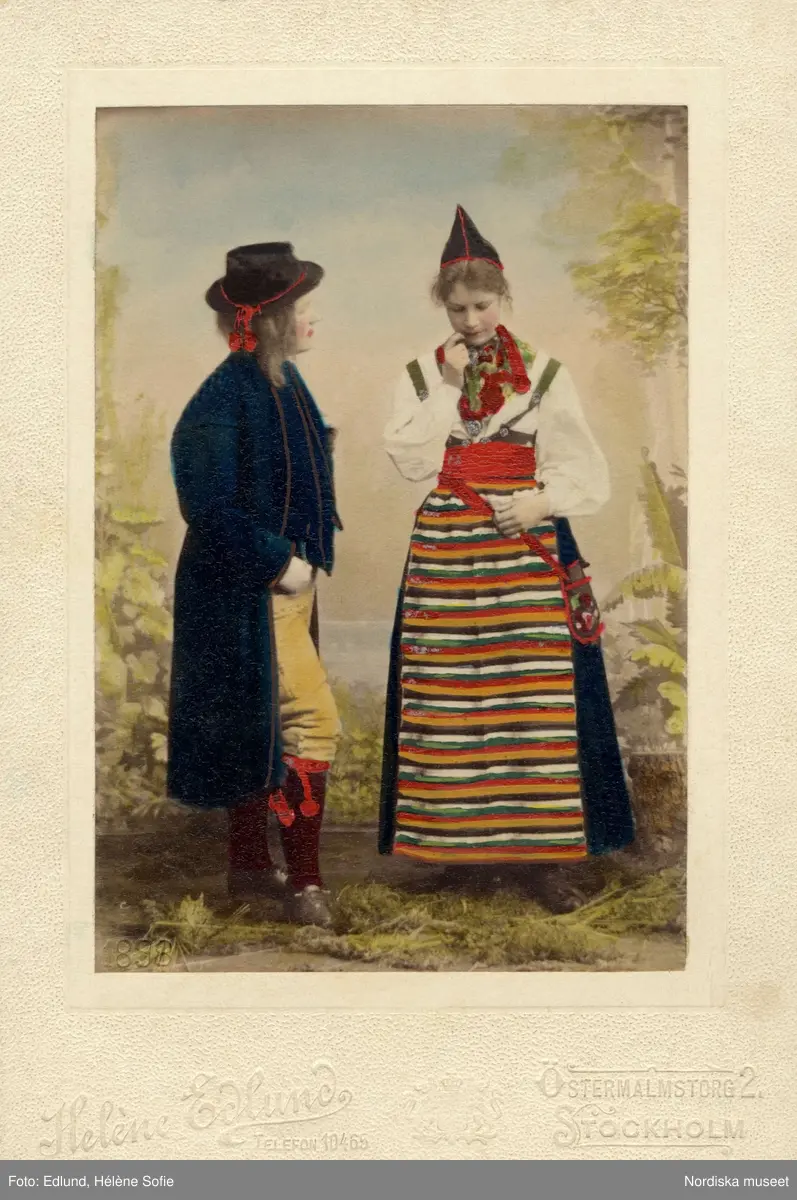 En kvinna och man poserar i folkdräkt. handkolorerat fotografi.