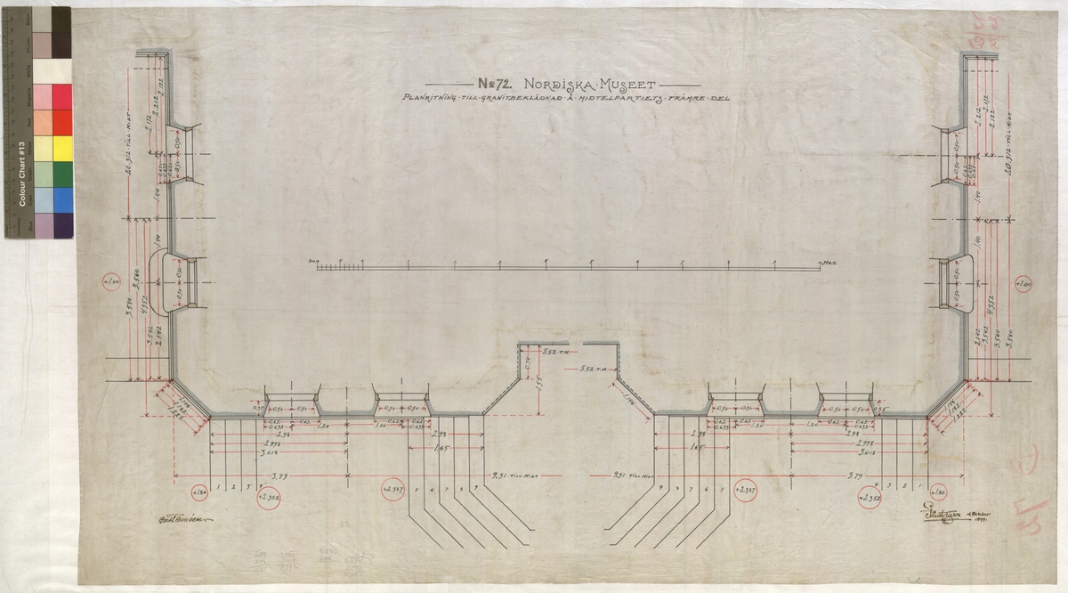 Ritning på väv över Nordiska museets huvudbyggnad. Planritning till granitbeklädnad för mittenlpartiets främre del. Plan. Jordvåning, mittenpartiet.50,5x85,5 cm. Tusch, grått och rött. Linjalritning. I Gust Clason 4 oktober 1899. I Gust Améen.