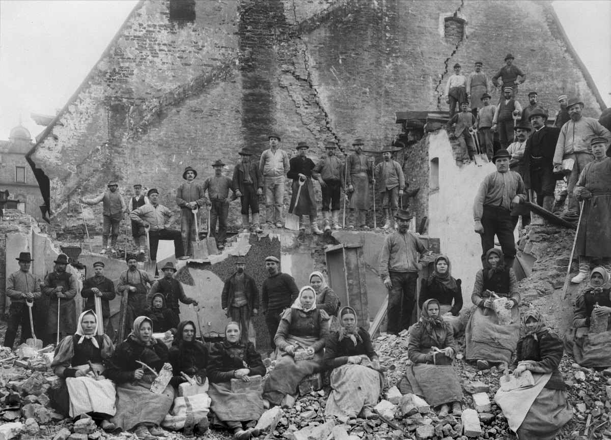 Rivning av hus. Ett stort arbetslag bestående av kvinnor och män med redskap i händerna. Skeppsbron 18, Stockholm.