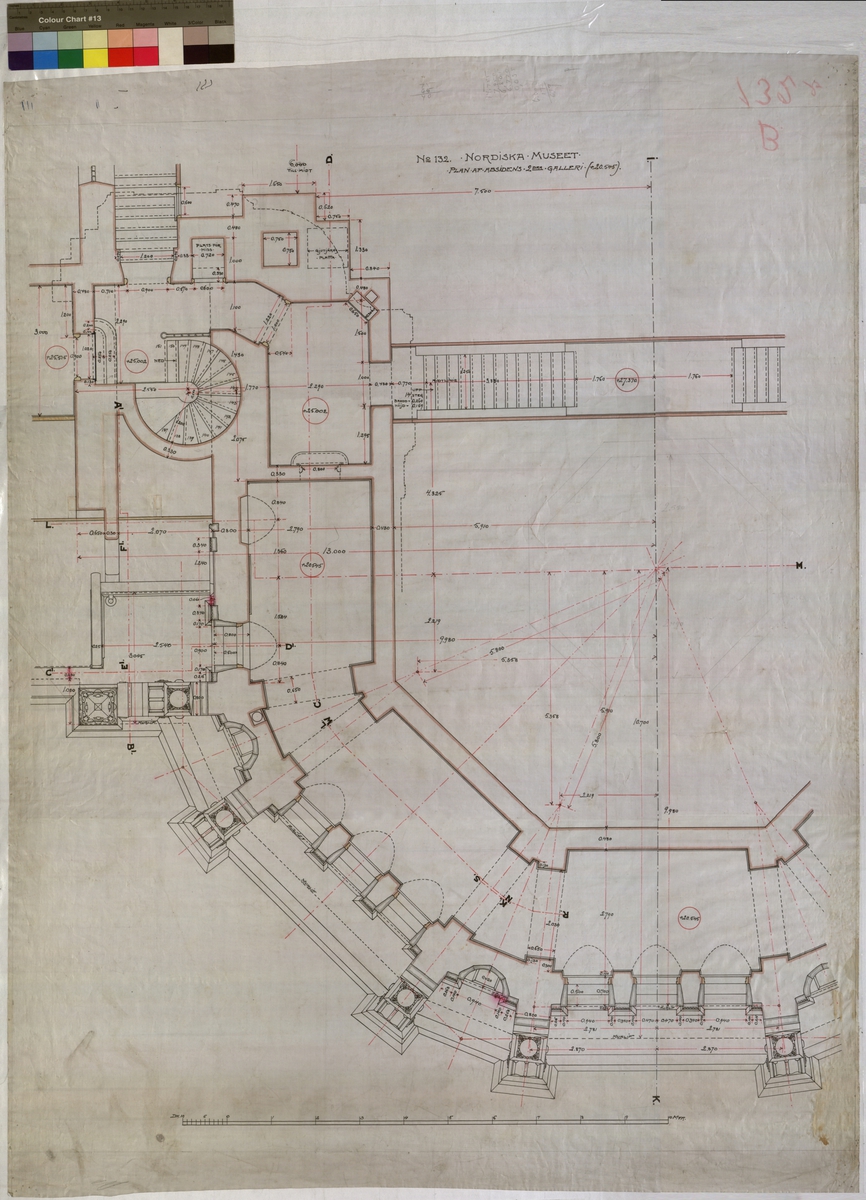 Ritning på väv över Nordiska museets huvudbyggnad. Plan av absidens andra galleri. Plan. Absiden, 2:a galleri. 102x76,5 cm. Tusch, rött, gult, grått och brunt. Linjalritning. Osignerad.