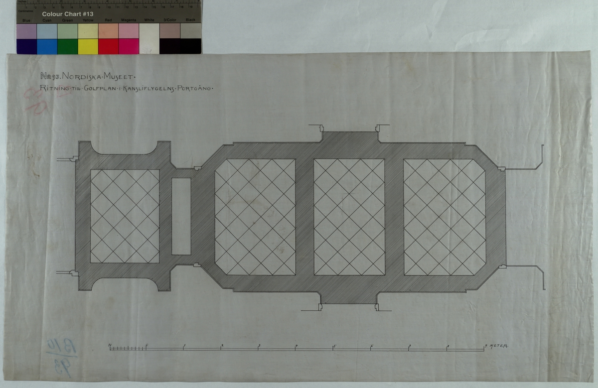 Ritning på väv över Nordiska museets huvudbyggnad. Ritning till golvplan i Kansliflygelns portgång. Plan. Norra porten, tvärgången, golv. 36x64 cm. Tusch. Linjalritning. Osignerad.