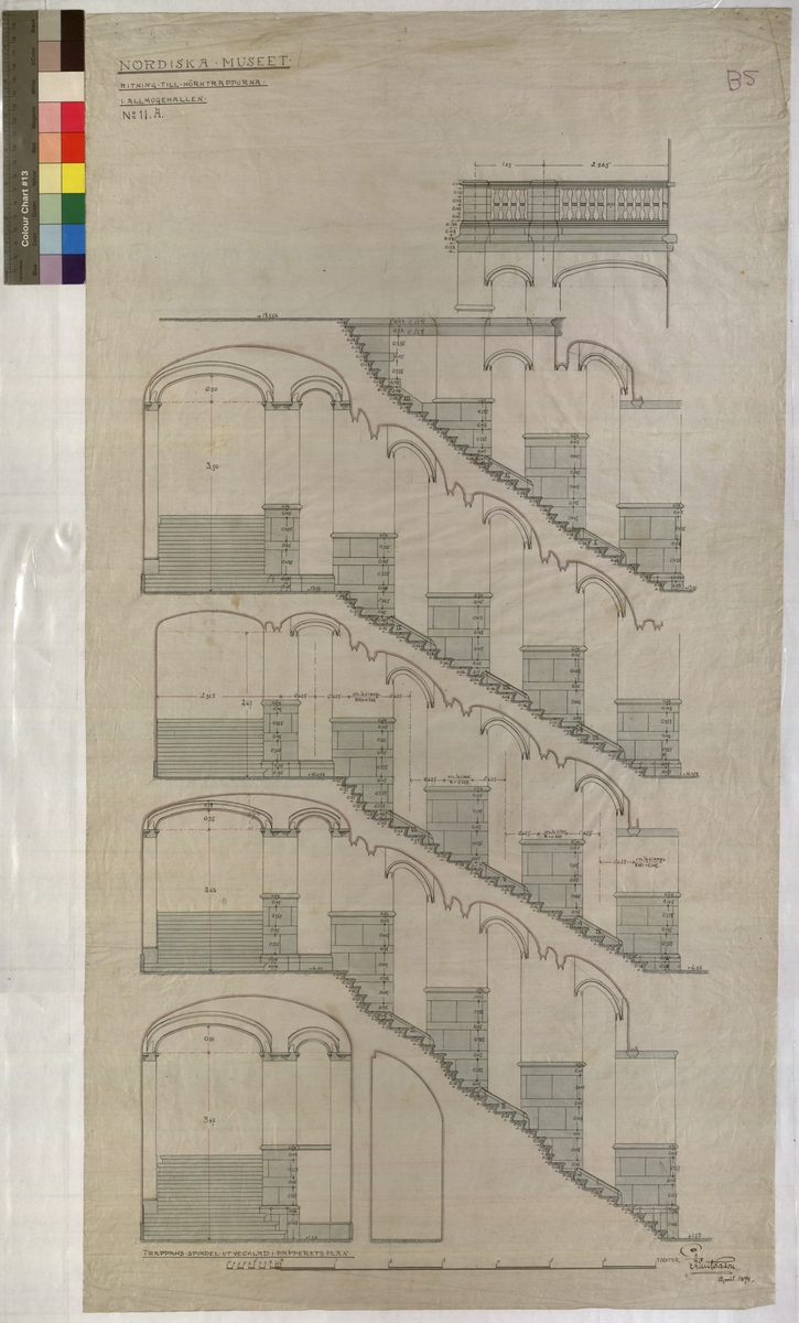 Ritning på väv över Nordiska museets huvudbyggnad. Ritning till hörntrapporna i allmogehallen. Sektionsritning. Jordvåning. Trapptorn. 96x52 cm. Tusch, brunt, grått. Linjalritning. Signerad: "I Gust Clason april 1894".