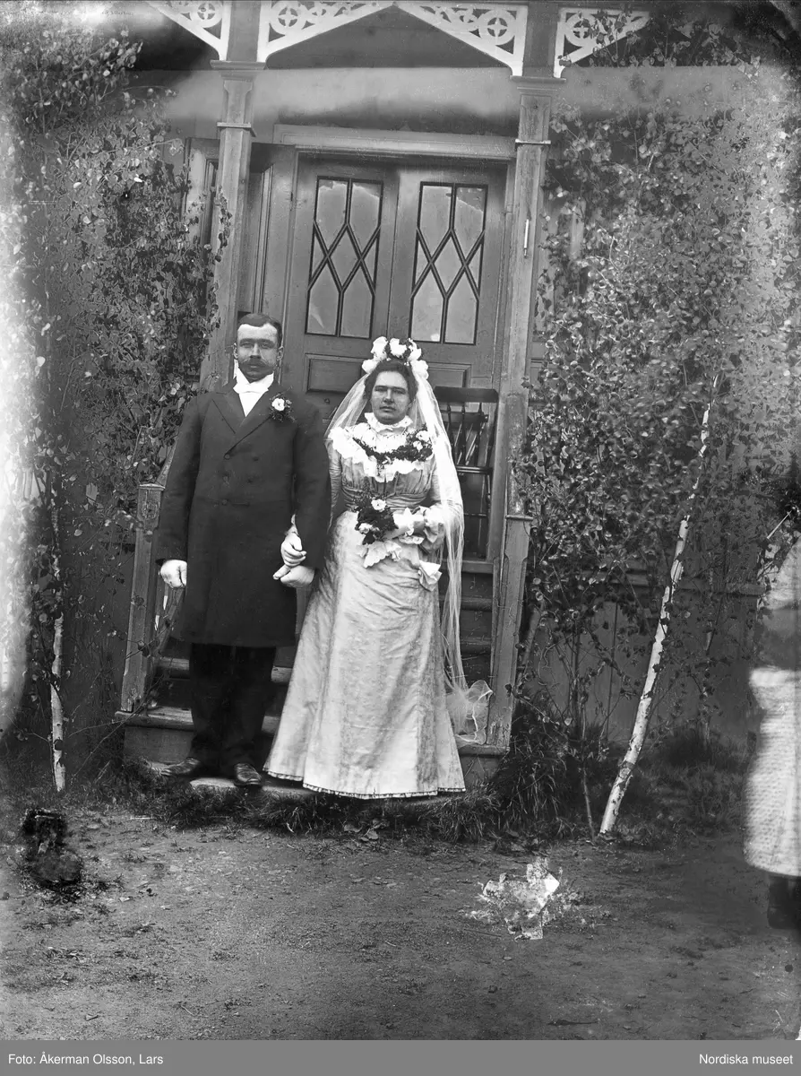 Brudpar stående på yttertrappa. Bröllop i Åsen 24 juni 1903 mellan Fil-Martin Larsson från N. Finnskoga (f. 1872) och Mångs Johanna Andersson från Bärvallen (f. 1866).