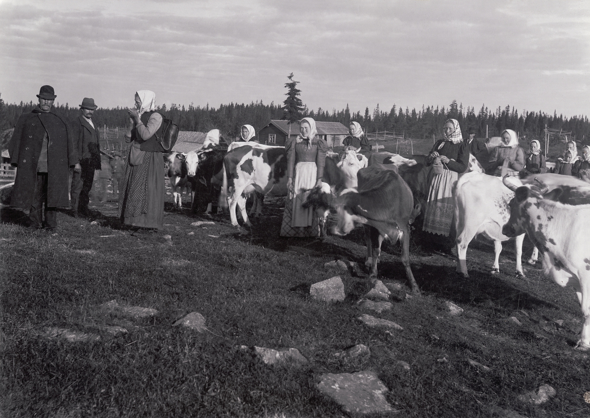 Nyckelbergs fäbodar i Malung, Dalarna. Män och kvinnor bland kor.