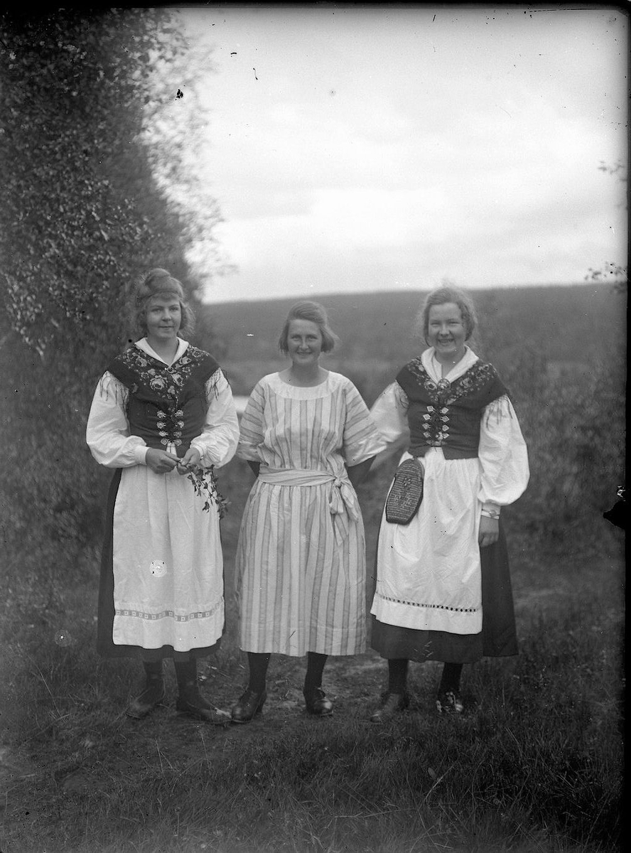 Porträtt av tre kvinnor i folkdräkter i utomhusmiljö. Lima, Dalarna.