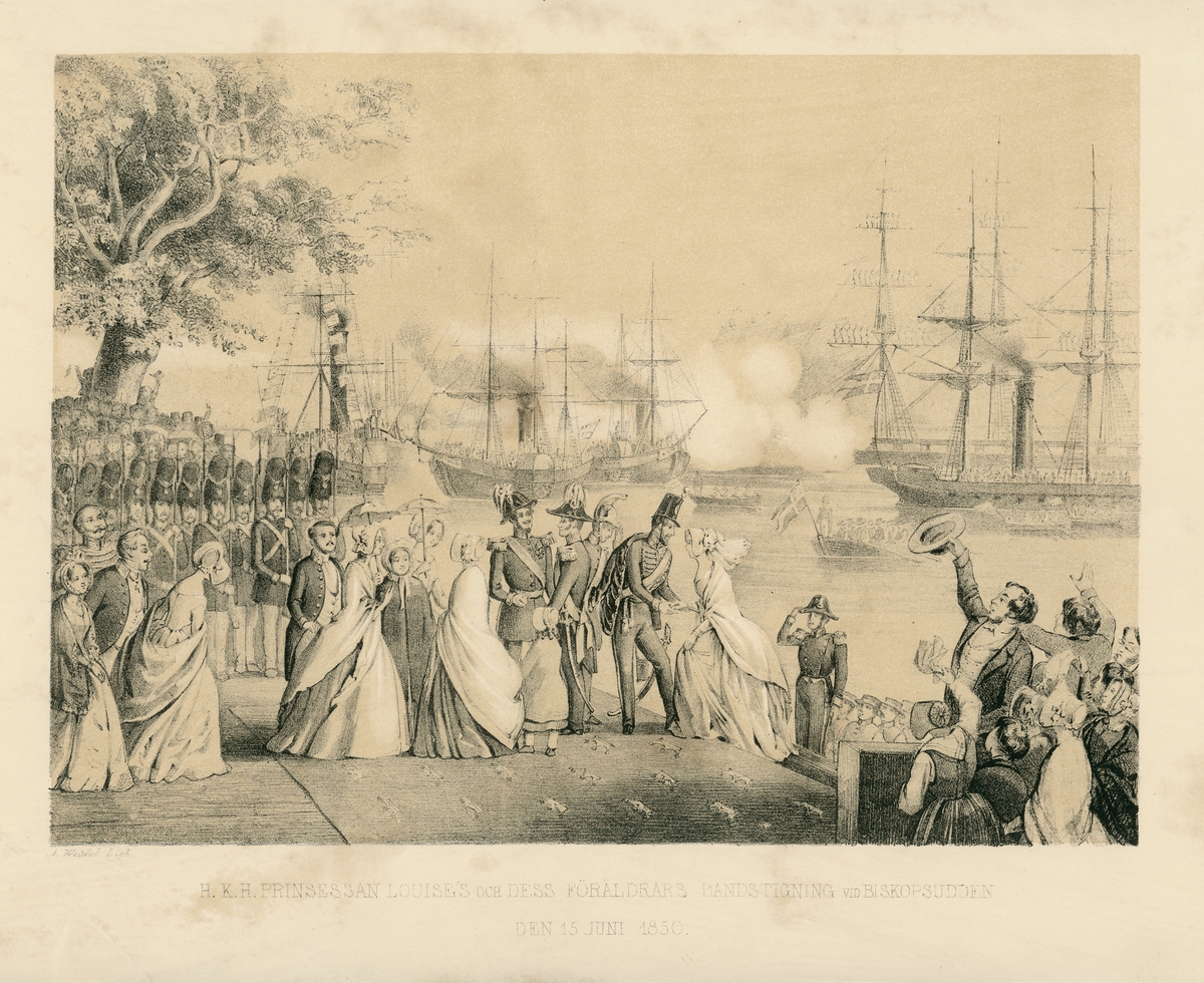Litografi. "H.K.H. Prinsessan Louises och dess föräldrars landstigning vid biskopsudden den 15 juni 1850". Litografi av A. Weidel.